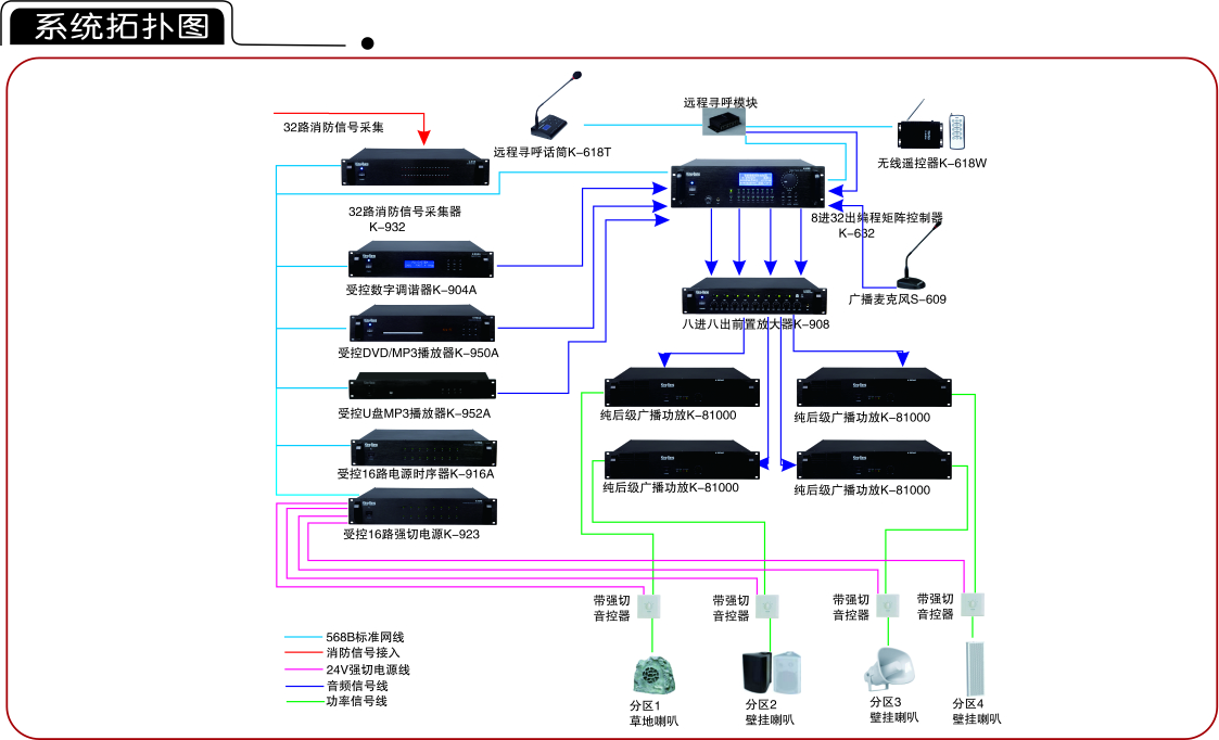 5.緊急廣播:緊急事故情況發生時,能及時播放緊急廣播信息,KING-BANG公共廣播系統的其它功能(背景音樂、一般廣播等)將被暫停,快速起到緊急疏散人群,引導人員疏散方向;直到緊急廣播狀態解除;